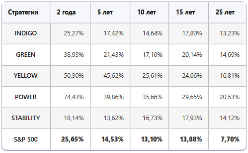 | Стратегия | 2 года | 5 лет | 10 лет | 15 лет | 25 лет |